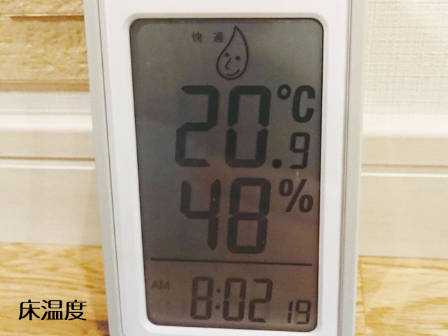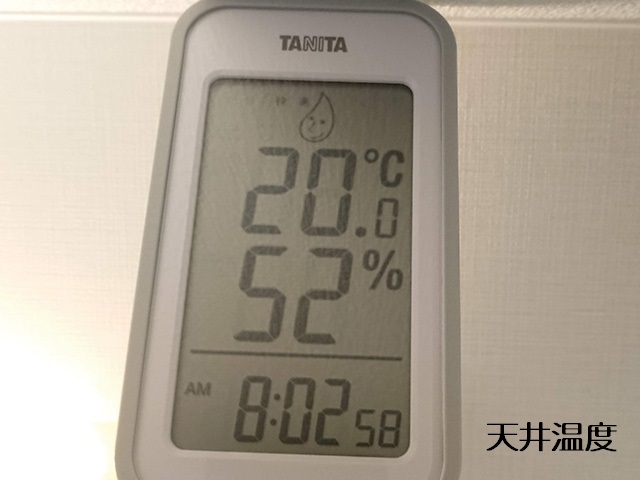 市販のごく一般的な室温計ですので誤差もあるでしょうが、測定結果は天井付近、床付近共に設定温度付近でほぼ20℃でした。