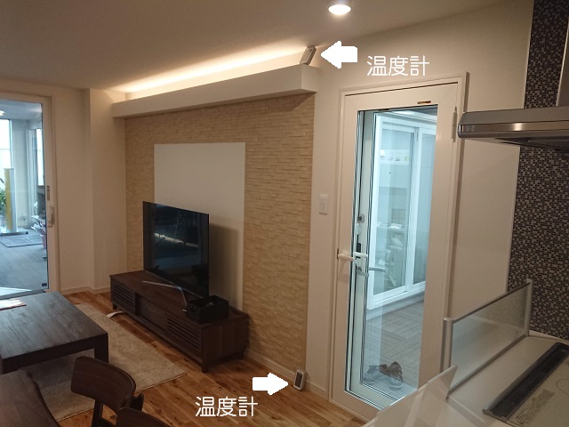 下の写真のように、部屋の上下に室温計を設置し、空気の温度を測定しました。