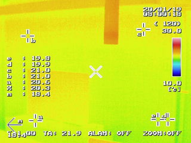 先の写真と同じ角度からサーモグラフィーで観察してみても、カーソル位置での計測温度は19.8℃~21.0℃と空気の温度とほぼ同じ放射温度を示しています。