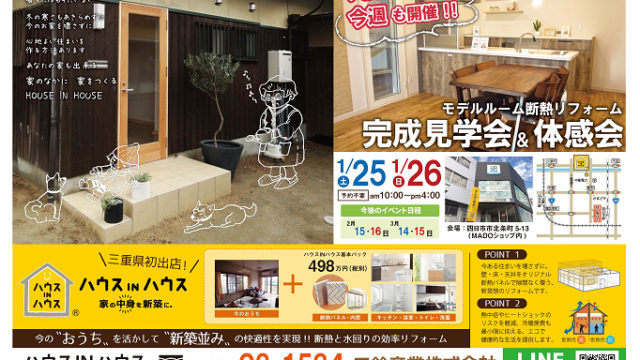 2020年1月20日 / 最終更新日 : 2020年1月20日 ハウスインハウス四日市東1月25・26日 体感会開催! 『断熱リノベーションモデルハウス体感会』大好評に付き今週も開催いたします。 築50年の寒~い倉庫をリノベーショ […]
