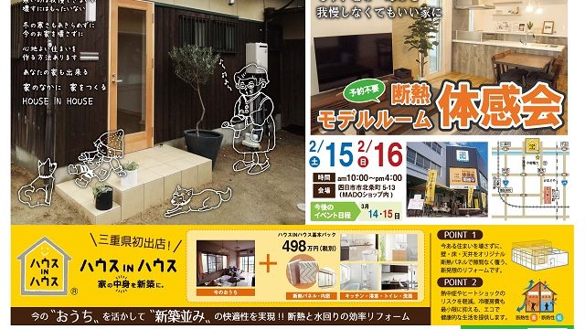 2020年2月10日 / 最終更新日 : 2020年2月10日 ハウスインハウス四日市東2月15・16日 体感会開催! ようやく本格的な冬到来ですね。 今月も『断熱リノベーションモデルハウス体感会』を開催いたします。 寒い時期だか […]