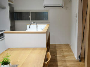 I様邸はもともと、ご両親の家の隣に建てられた納屋を兼ねた家でした。そのため大きな車庫が1階の半分を占める2LDK。夫婦と息子1人の3人家族には十分でしたが、女の子が生まれるとそれぞれの子供部屋が必要と考え、リフォームを検討し始めます。ところが、なんとその後10年間、I様ご夫婦は新築かリフォームかで悩むことになります。I様が悩んだ原因…それはキッチン。奥様には憧れのカフェと同じような「キッチン空間」を持ちたい夢がありました。その夢は絶対に叶えたい。主だったリフォーム会社はほとんど見ましたが、いずれもコストが掛かり、新築にした方が良いと思うほど。しかし、新築だとどうしてもキッチン設備以外にもコストが掛かり、こちらも厳しい。さらにお子様のアレルギーで、建材が選べないことも問題でした。
